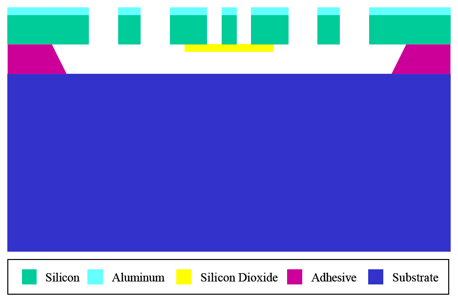 Cross-sectional view of thin layers. Film thicknesses are as follows: aluminum : 0.5um (Mask #2: STRUCTURE) silicon : 20um (Mask #2: STRUCTURE) Oxide: 1.6um (Mask #1: BRIDGE) Bond Layer: 20um