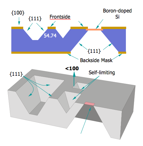 Frequently, when using bulk micromachining it is desirable to make thin membranes of silicon or control the etch depths very precisely. As with any chemical process, the uniformity of the etching can vary across the substrate, making this difficult. Timed etches whereby the etch depth is determined by multiplying the etch rate by the etch time are difficult to control and etch depth is very dependent on sample thickness uniformity, etchant species diffusion effects, loading effects, etchant aging, surface preparation, etc. To allow a higher level of precision in anisotropic etching the MEMS field has developed solutions to this problem, namely etch stops. Etch stops are very useful to control the etching process and provide uniform etch depths across the wafer, from wafer to wafer, and from wafer lot to wafer lot. There are two basic types of etch stop methods that are used in micromachining: dopant etch stops and electrochemical etch stops.