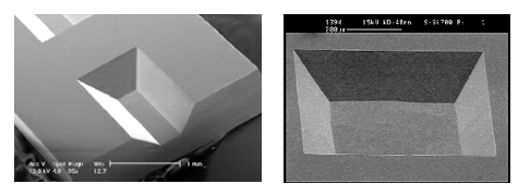 Figure 2 below is an illustration of some of the shapes that are possible using anisotropic wet etching of <100> oriented silicon substrates including an inverted pyramidal and a flat bottomed trapezoidal etch pit. Note that the shape of the etch pattern is primarily determined by the slower etching <111> planes. Figures 3a and 3b are SEM photographs of a silicon substrate after an anisotropic wet etching. Figure 3a shows a trapezoidal etch pit that has been subsequently diced across the etch pit and Figure 3b shows the backside of a thin membrane that could be used to make a pressure sensor. It is important to note that the etch profiles shown in the Figures are only for a <100> oriented silicon wafer; substrates with other crystallographic orientations will exhibit different shapes. Occasionally, substrates with other orientations are used in MEMS fabrication, but given the cost, lead times and availability, the vast majority of substrates used in bulk micromachining have <100> orientation.