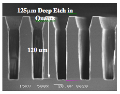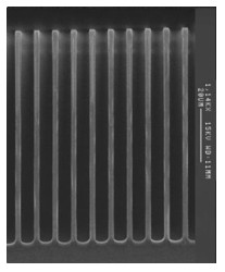 Figure 9 is a cross section SEM of a silicon microstructure fabricated using DRIE technology. As can be seen, the etch is very deep into the silicon substrate and the sidewalls are nearly vertical.