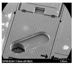 Figure 8 is a SEM of a MEMS component fabricated using DRIE and wafer bonding. This device was made using an SOI wafer wherein a backside etch was performed through the handle wafer, stopping on the buried oxide layer, and a frontside DRIE was performed on the SOI device layer. Then the buried oxide was removed to release the microstructure, allowing it to freely move.