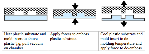 Heat plastic substrate and mold insert to above plastic Tg, pull vacuum on chamber. Apply forces to emboss plastic substrate. Cool plastic substrate and mold insert to de-molding temperature and apply force to de-emboss.